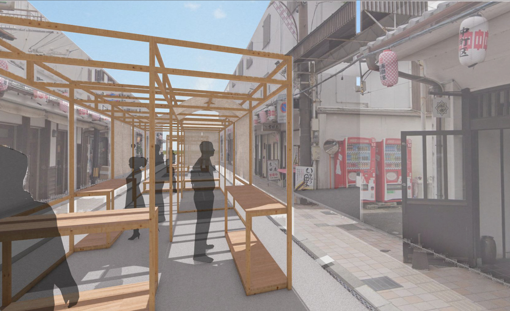 九大生とのコラボで中町通りのホコテン空間がアップデート!「のれん」や木材を組み合わせた「つな木」を活用し、いつもの通りが居心地の良い滞在スペースに。ビールケースを活用した椅子や棚、焚き火ブースも登場し、ゆっくり寛げる空間を演出します。
